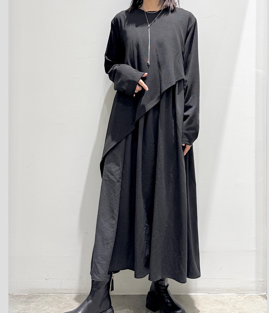 上半身は2枚重ね、中のワンピース部分はやや光沢のあるギャザーワンピースになっています。