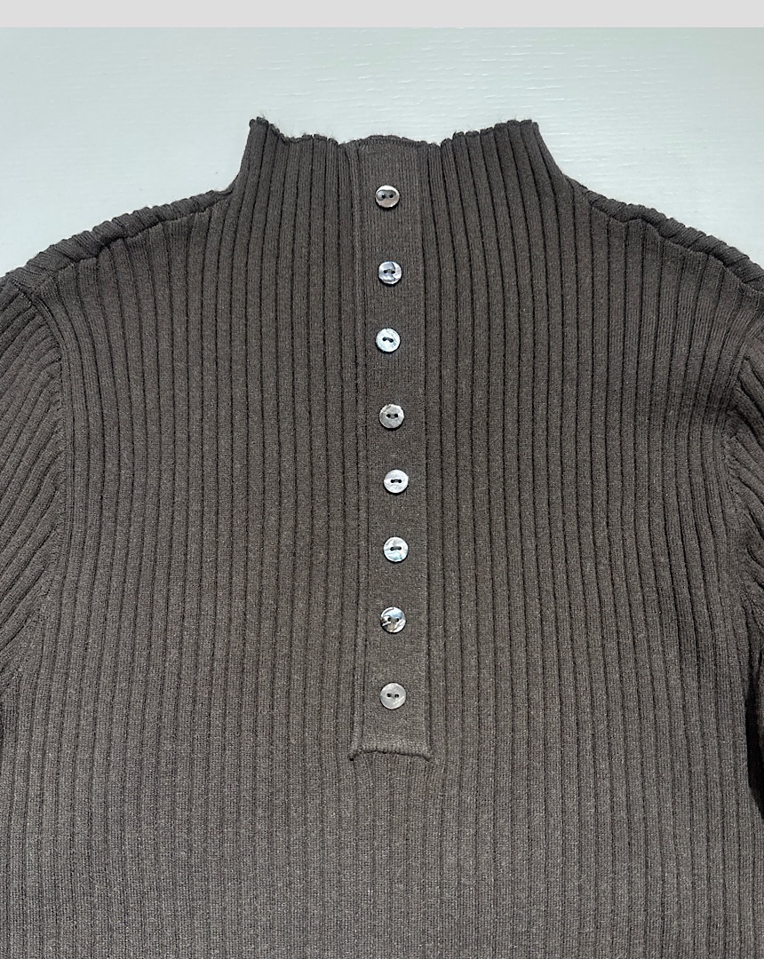 もっちりと柔らかいリブ編みのニットプルオーバー。ボトルネックで首まわりの締め付け感がなく、素肌でもストレスなく着られる滑らかニットを使用。