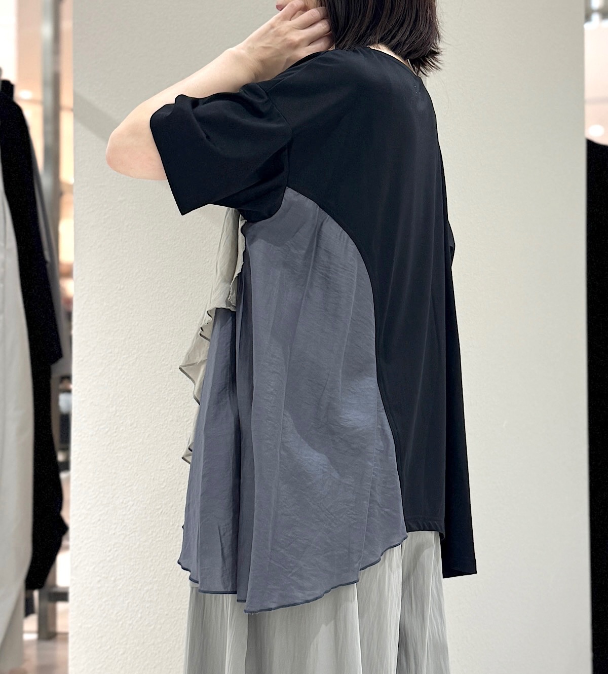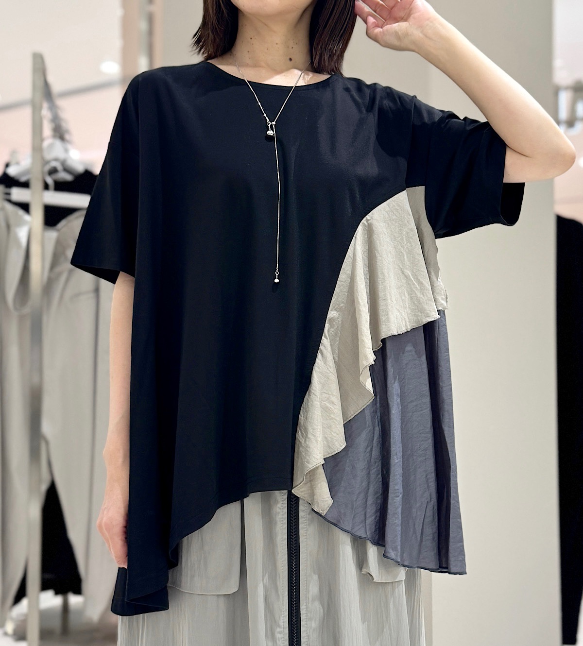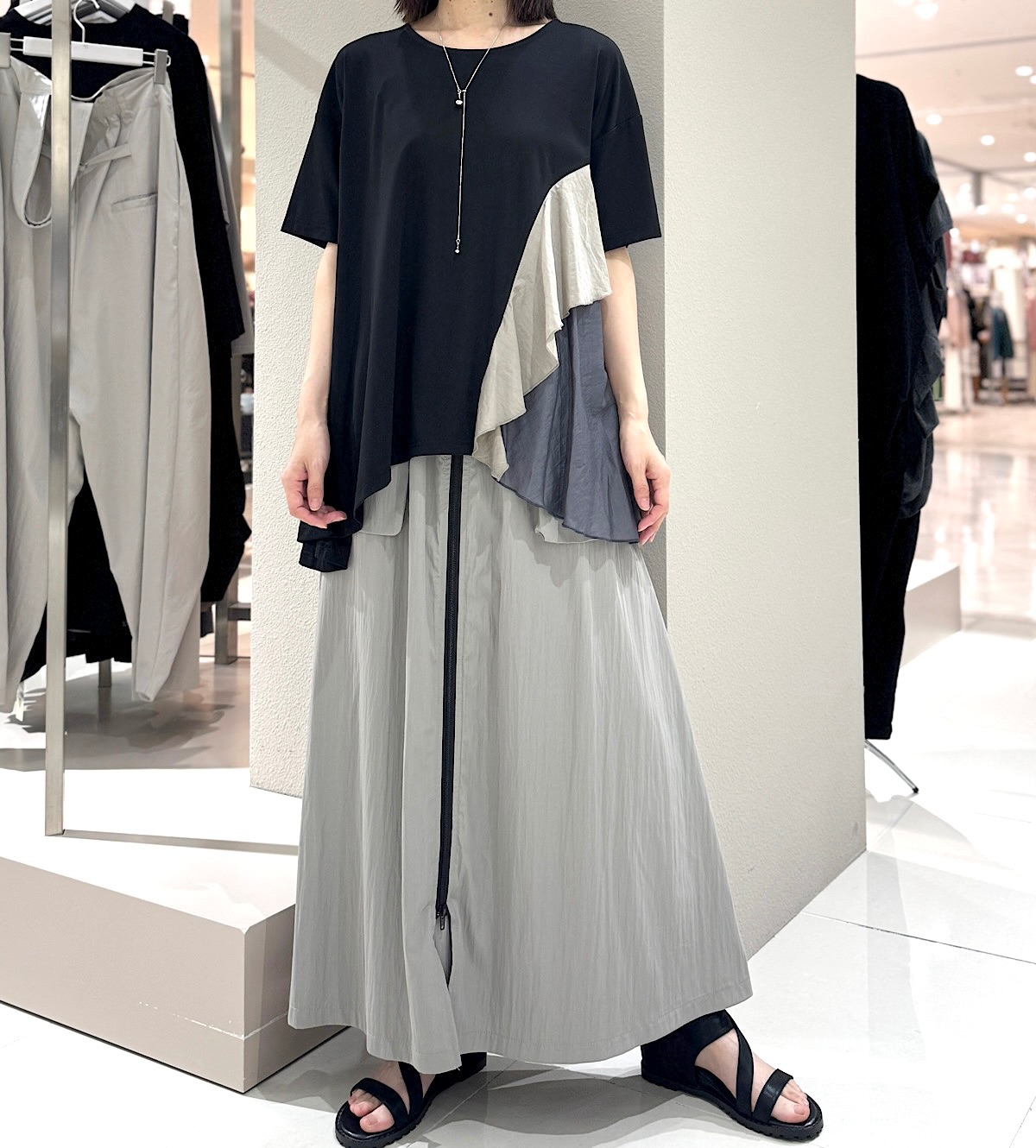 片方の裾にドレープ感が綺麗な布をドッキングさせたアシンメトリーなデザイン。