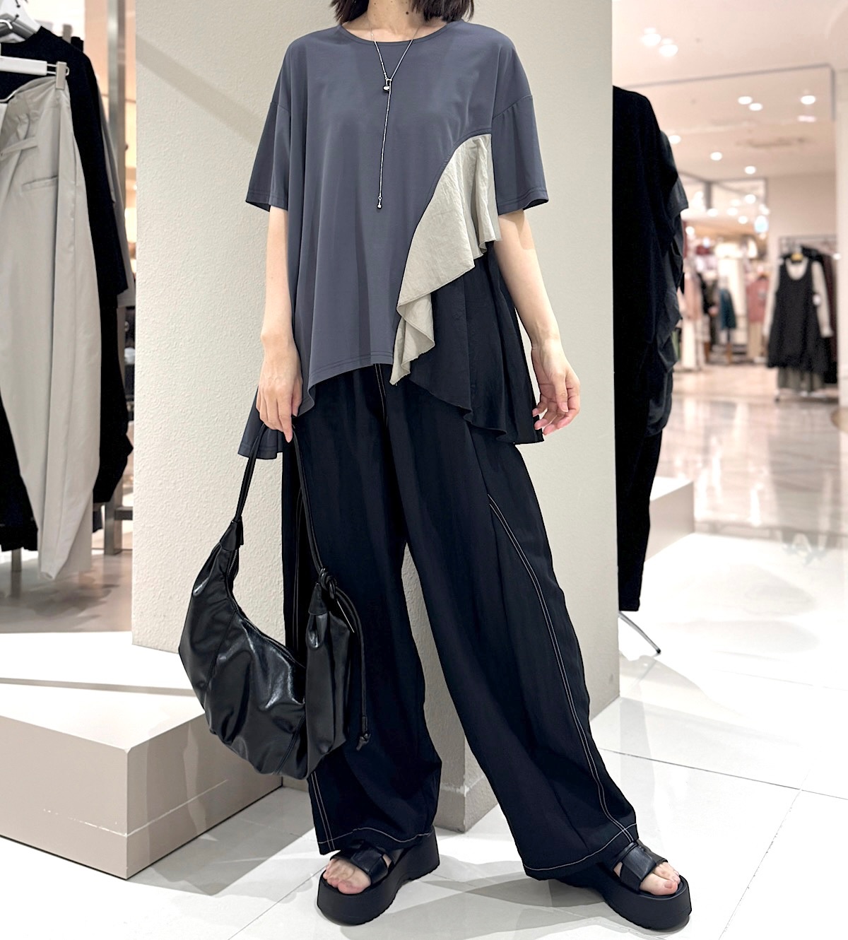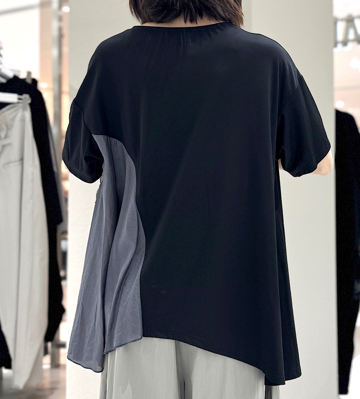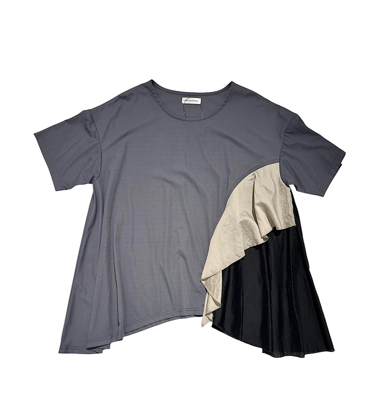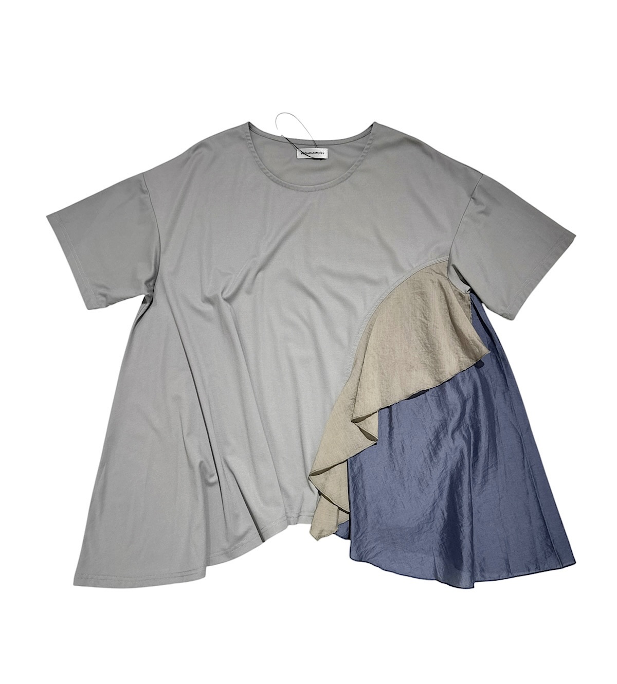 片方の裾にドレープ感が綺麗な布をドッキングさせたアシンメトリーなデザイン。