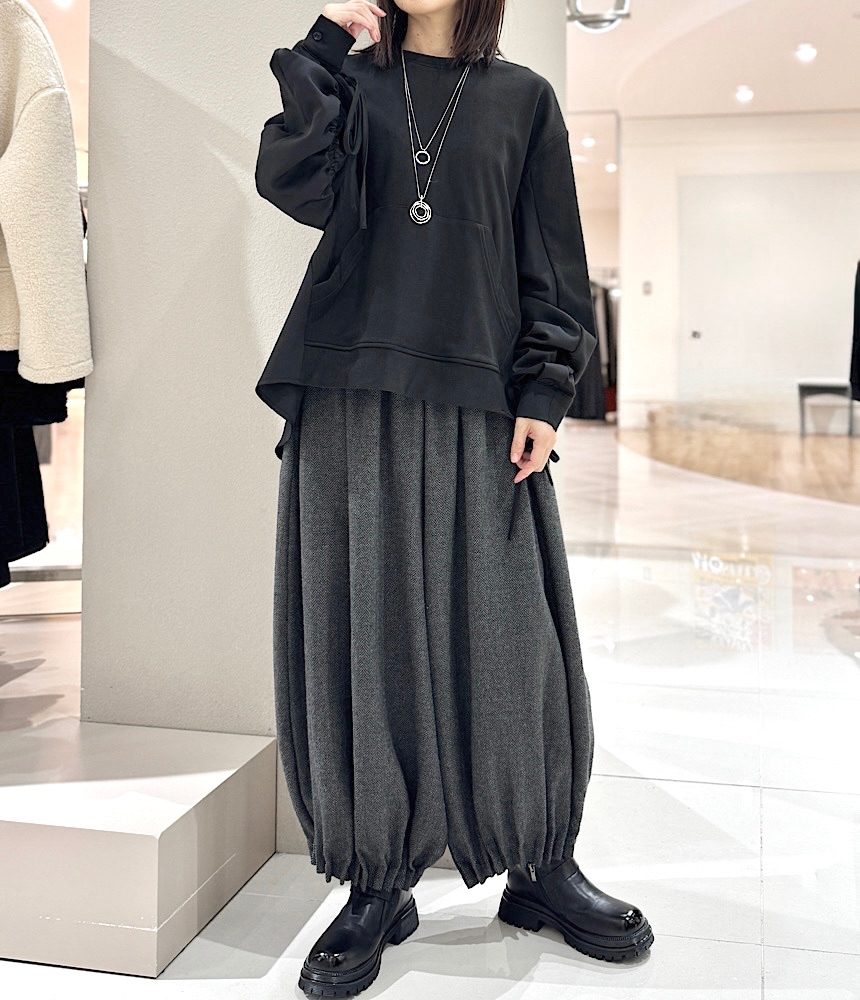 冬らしいヘリンボーン素材のタックワイドパンツ。裾にかけて丸みのあるシルエットはブーツとも相性が良い。