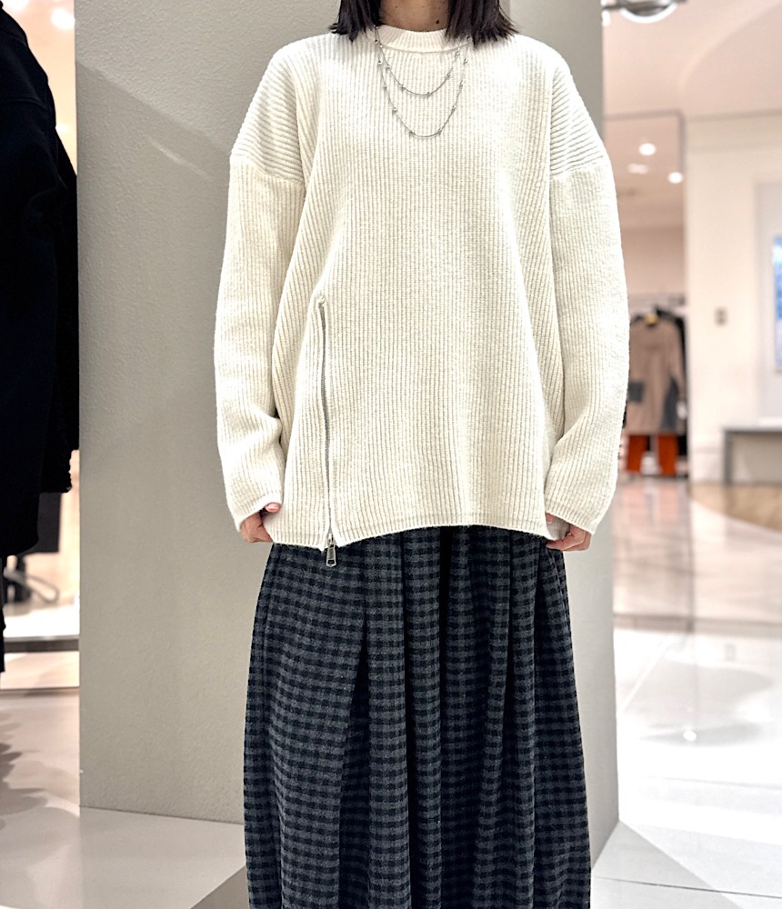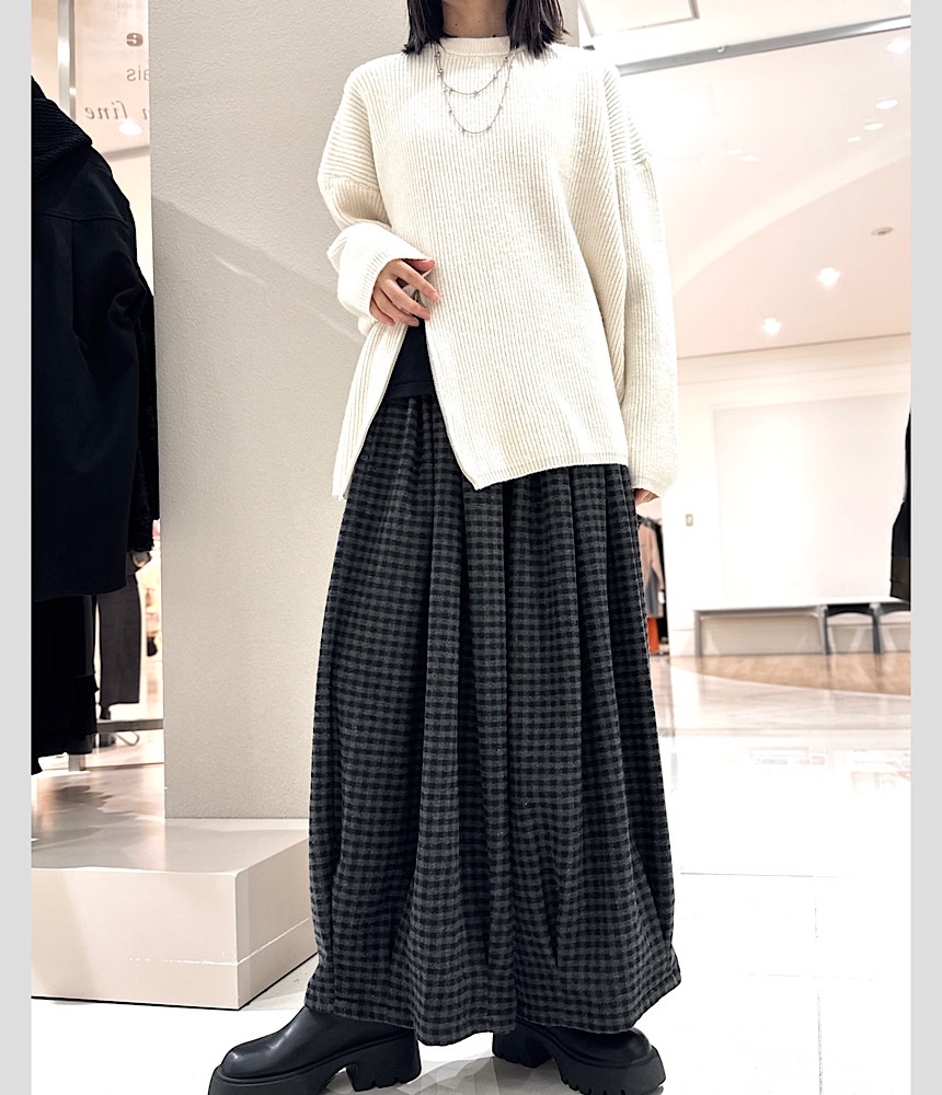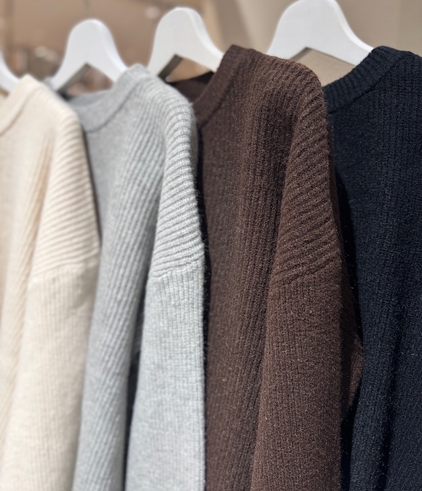ざっくり畦編みのニット。やや着丈は長めでオーバーサイズ、ゆるっと着られて温かさも抜群。