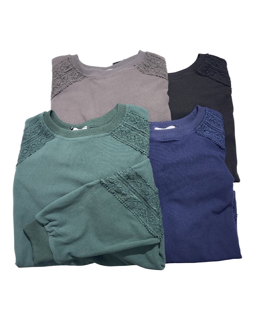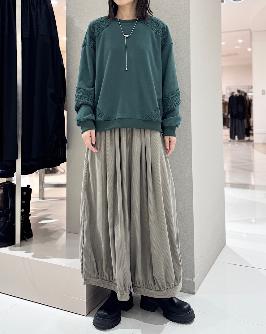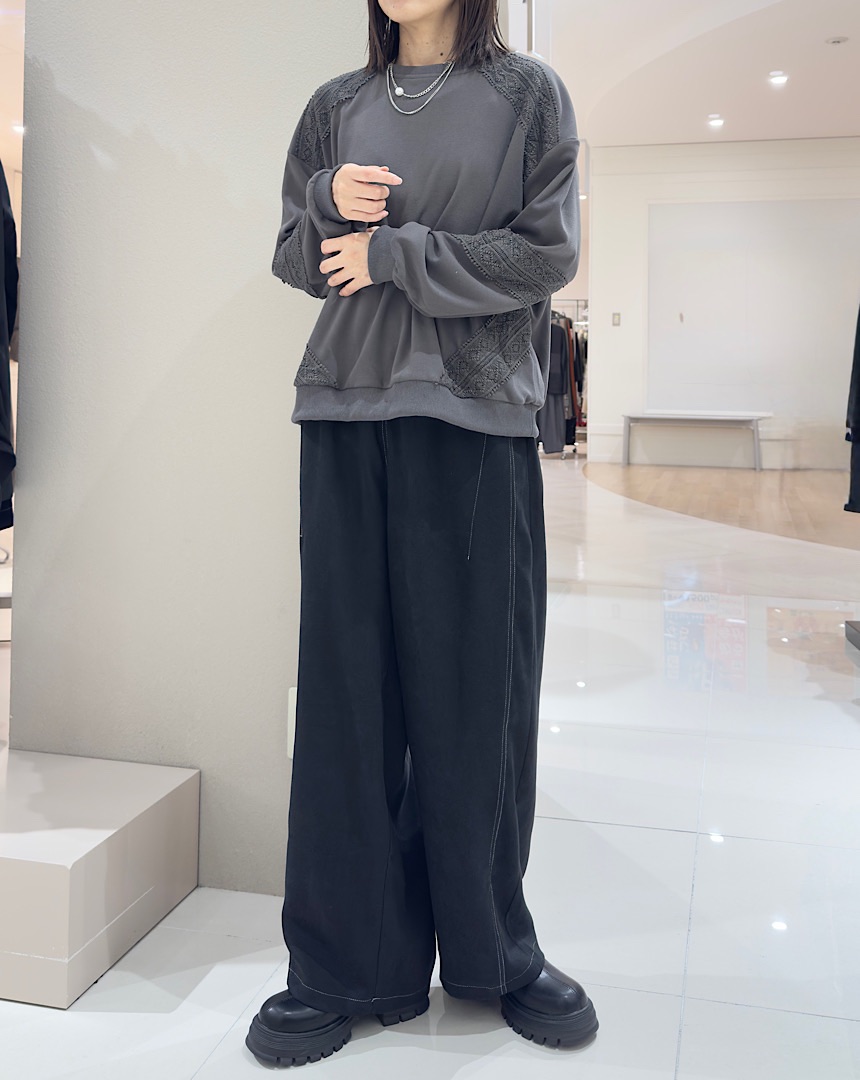 あたたかいフリースのような生地のトップス。素材やシルエットはカジュアルでも、レース使いが女らしい印象をプラス。ラフに着てボトムスにも合わせやすい、着回しのきくデザイントップス。
