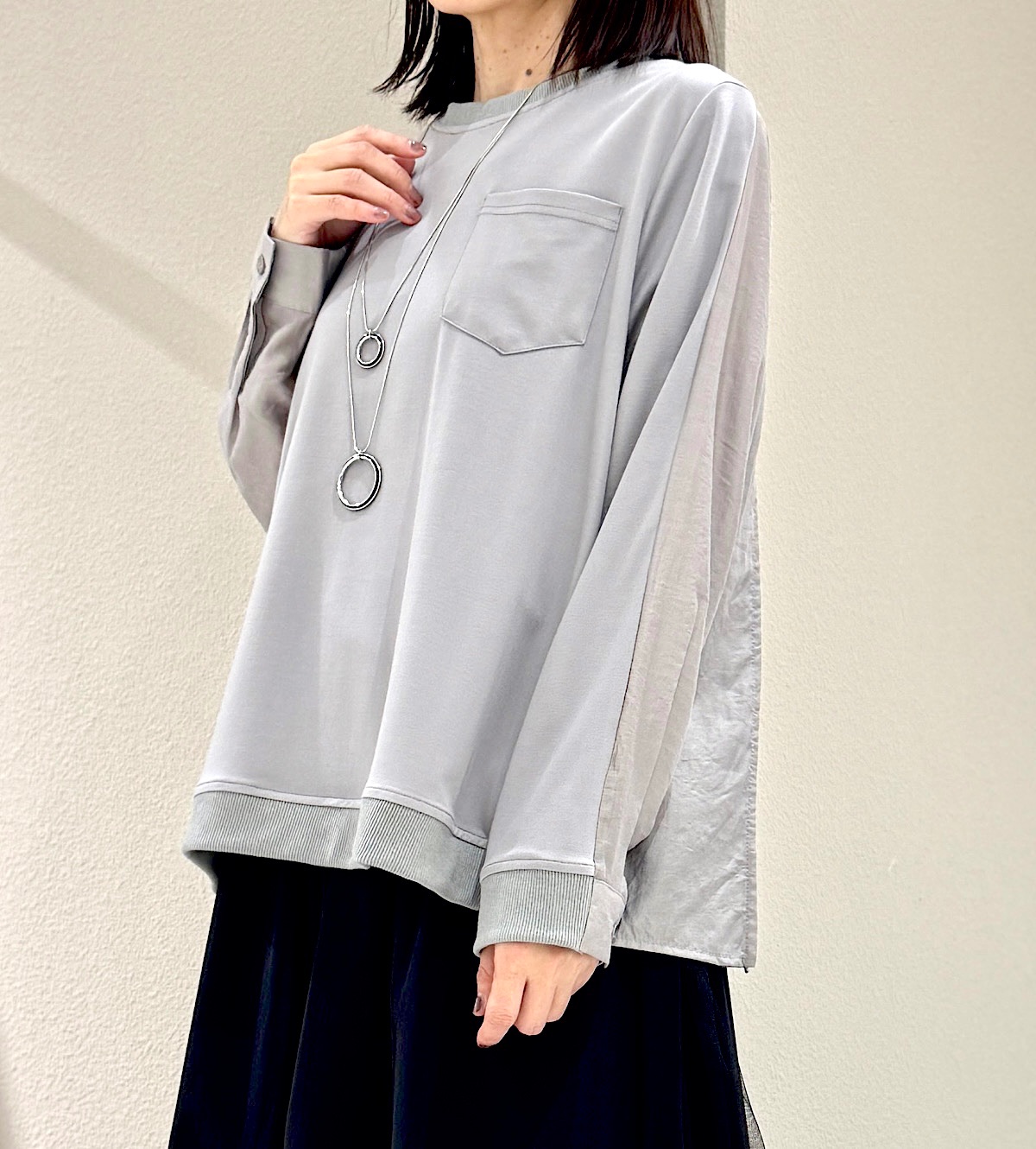 後ろはやや光沢のあるブラウス素材、前はカットソーになっているので、着心地も柔らかくてさらっと楽に着られます。