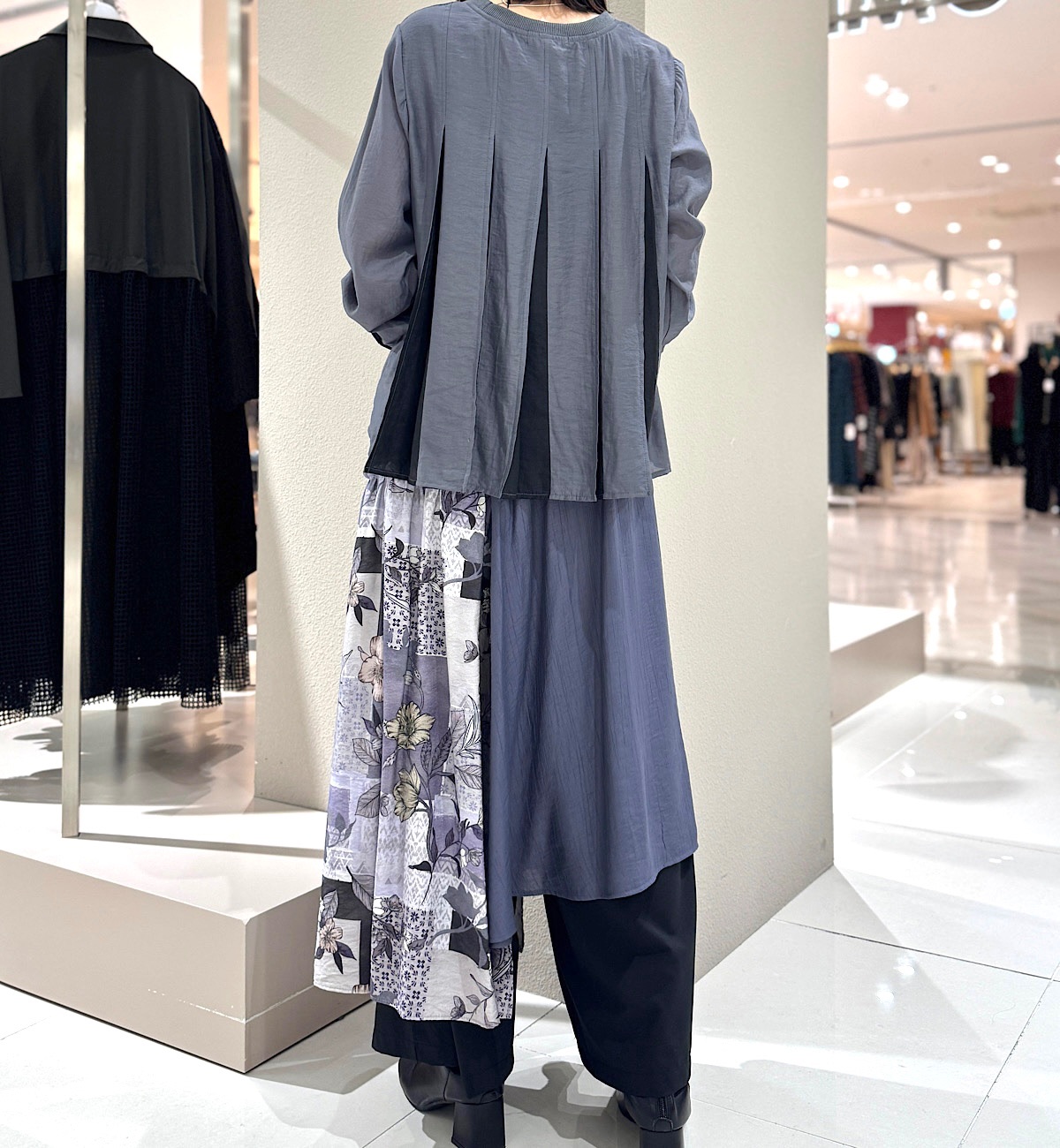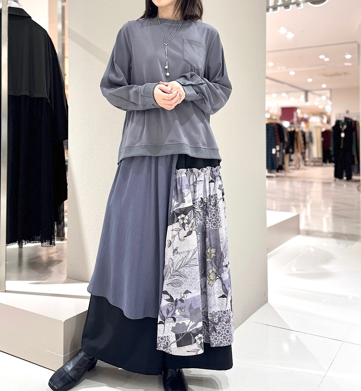 ワイドなパンツやスカートに合わせやすい丈になっているので、着回しがきき、4月末頃までは十分着ていただけます。