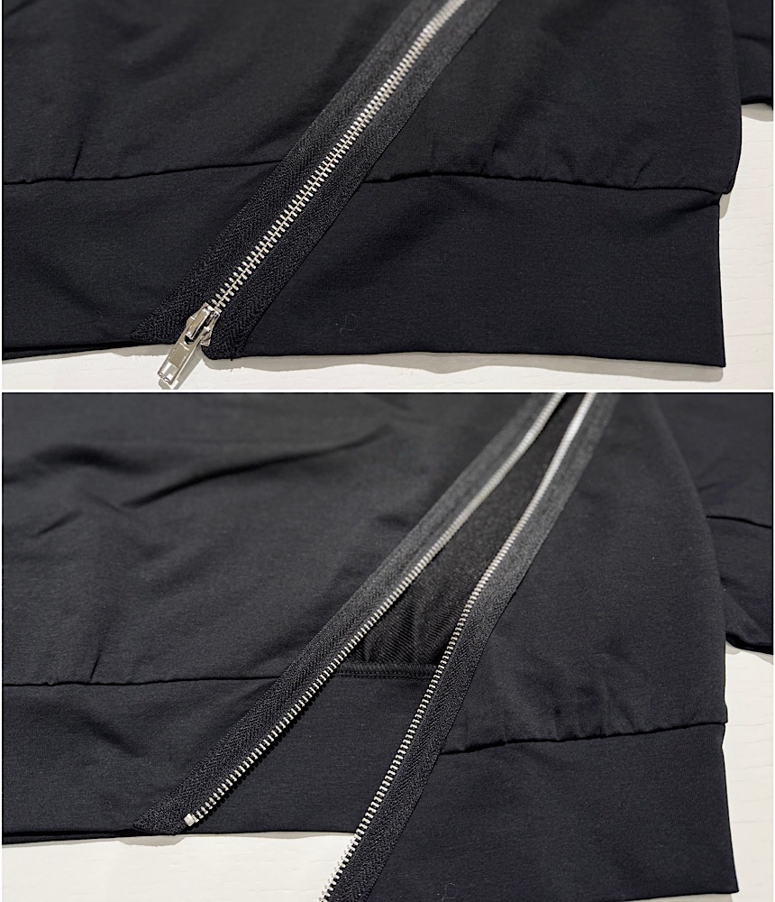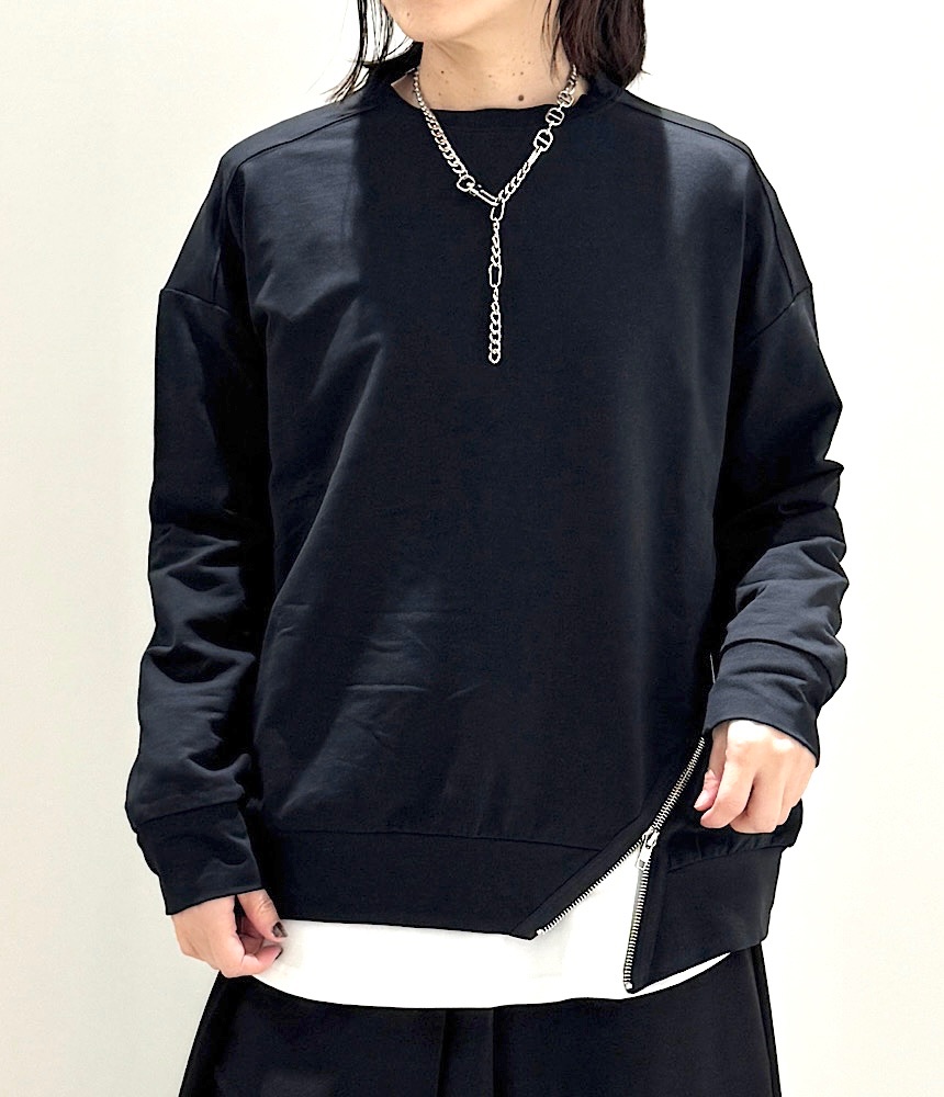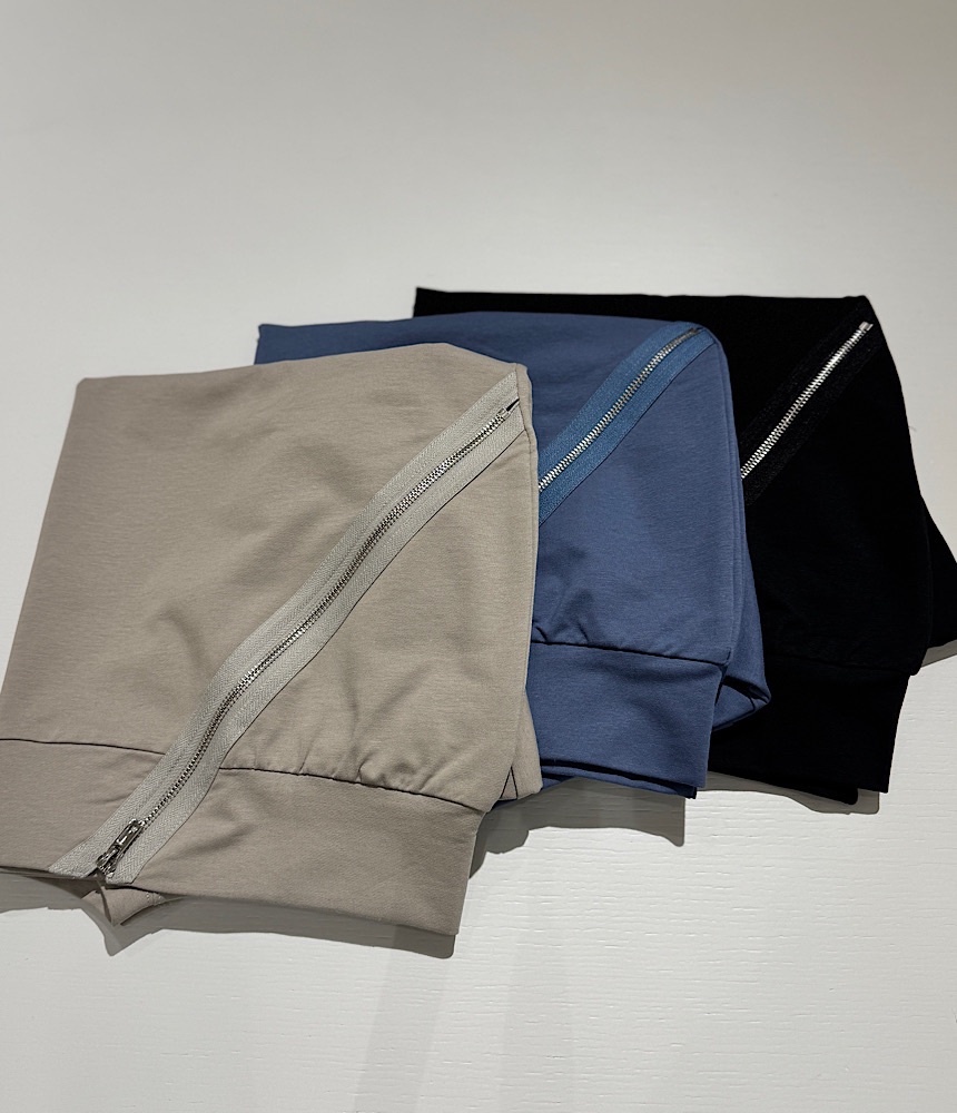 斜めに大胆についたジップが目を引くデザインカットソー。