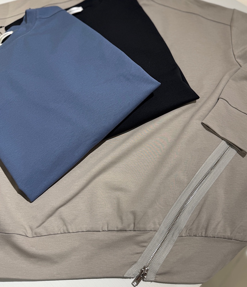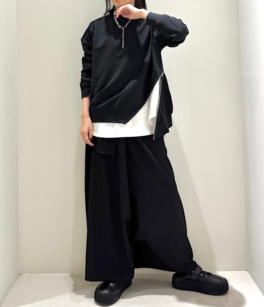 ジップはそのままでも開けてもOK。インに存在感のあるインナーを重ねると、違うデザインのようなアレンジができます。