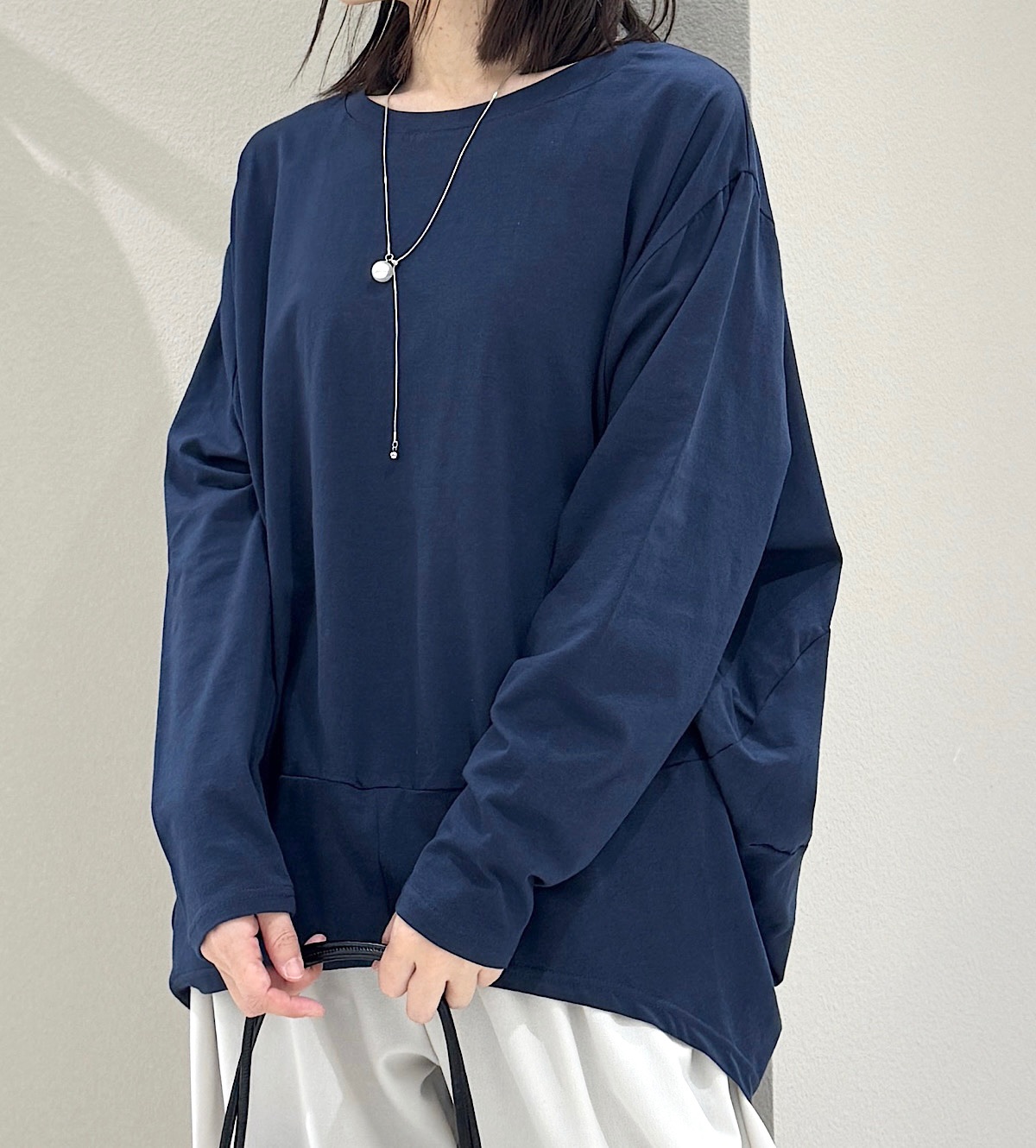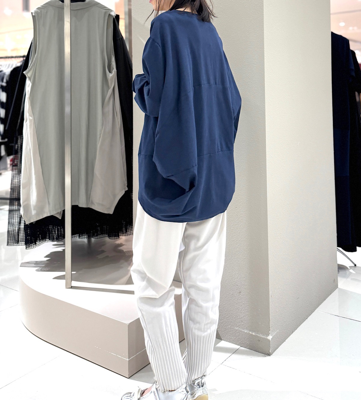 かなりゆったりとしたシルエットですが、軽くウエスト中央をインにすればロングスカートやワイドパンツ、カーブパンツにもあうバランスになります。