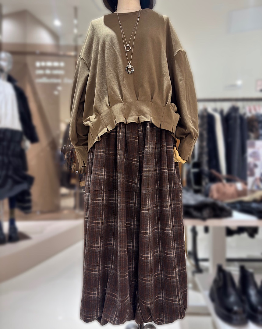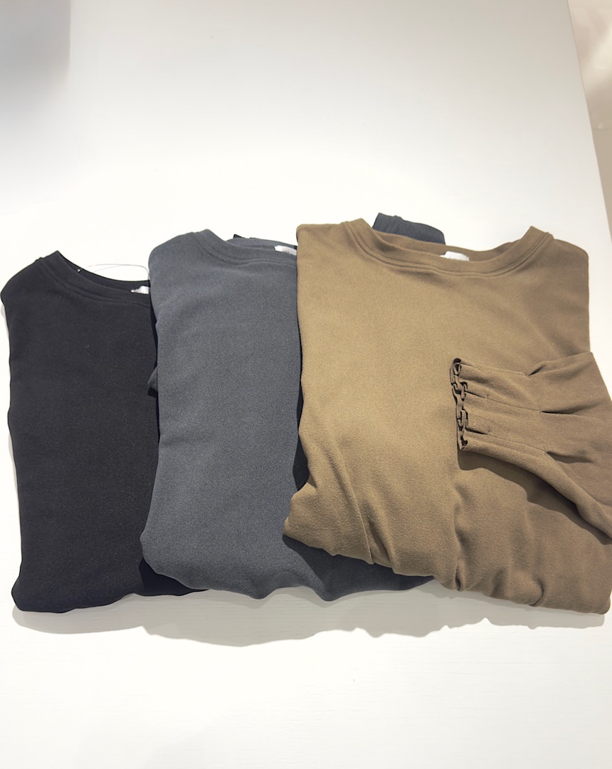 裾と袖のタックが目をひくデザインカットソー。マイクロフリースのようなもっちり暖かい生地。真冬まで着られる素材で、ウエストのデザインはどんなボトムスにも合わせやすい。