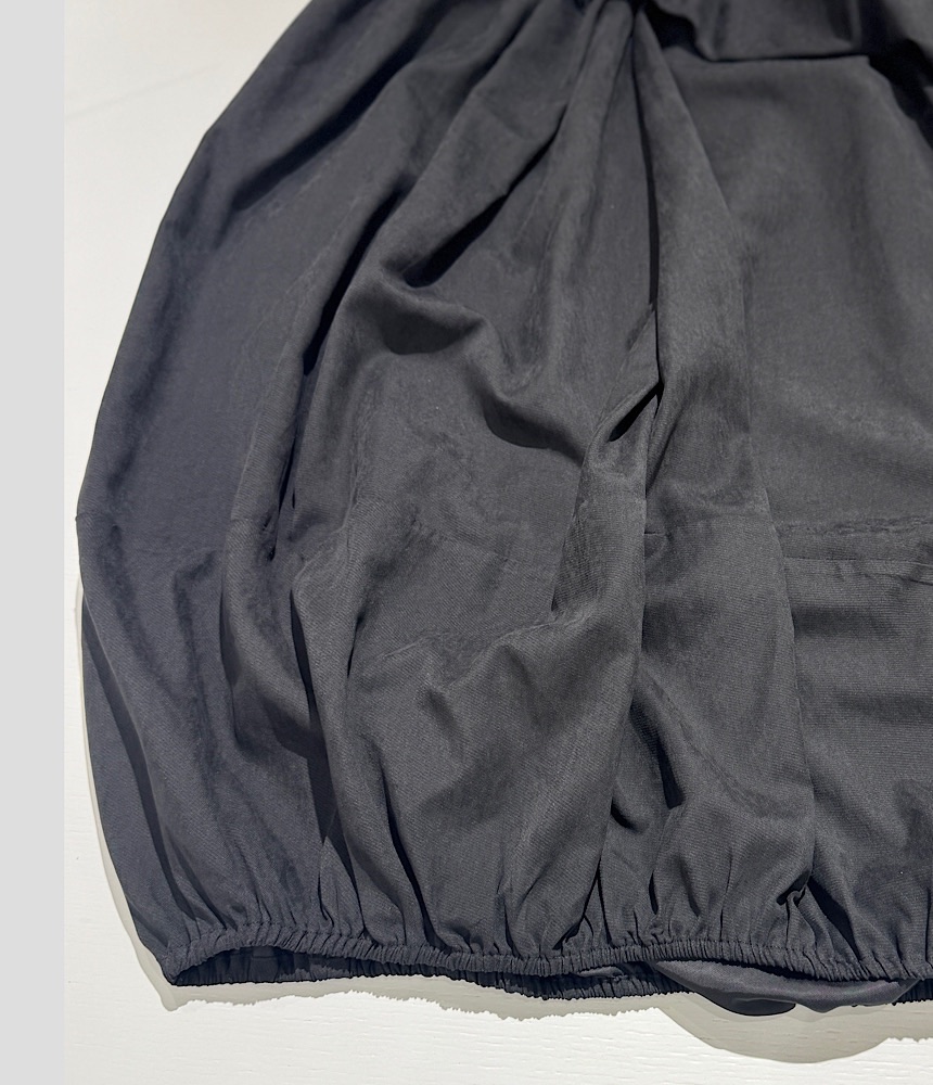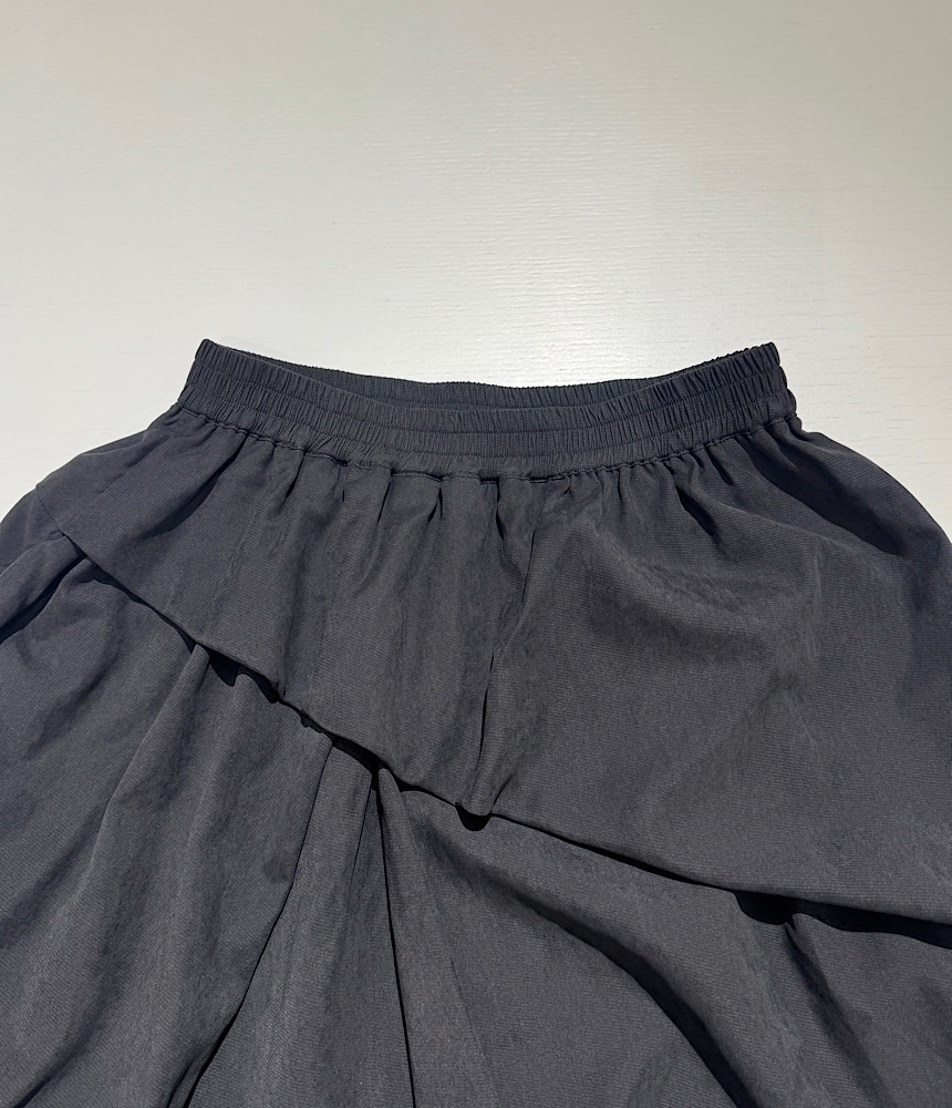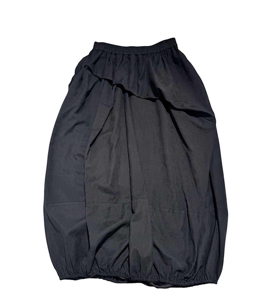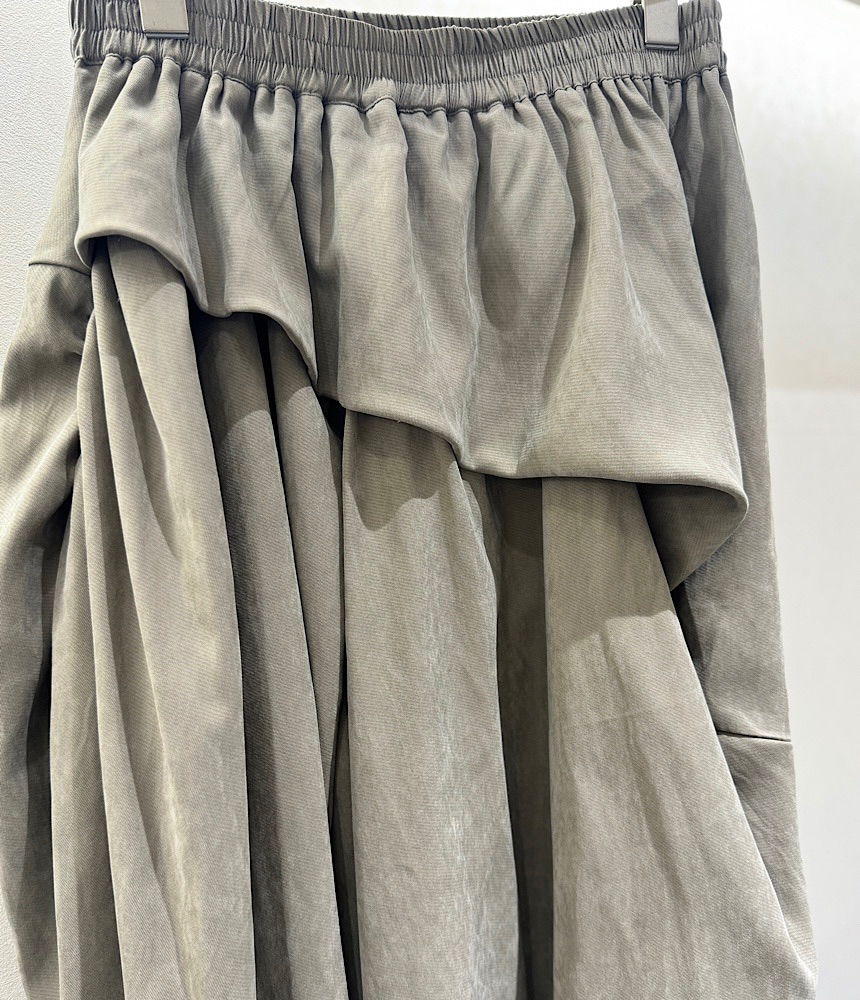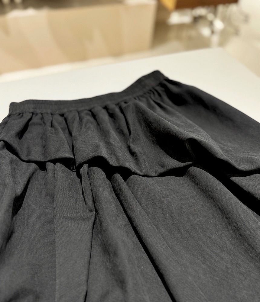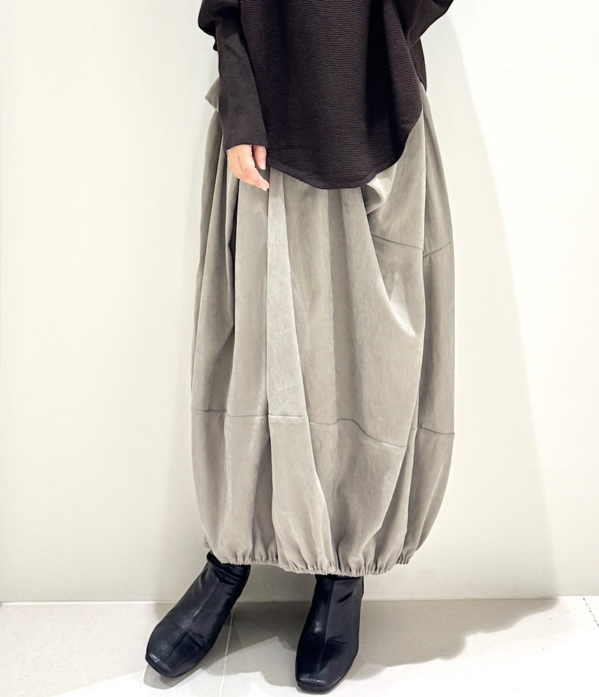 前身が重ねているように見えるデザインスカート。裾を絞ってあるのでバルーンスカートのようですが、すっきりとしたIラインで広がりにくい設計になっています。