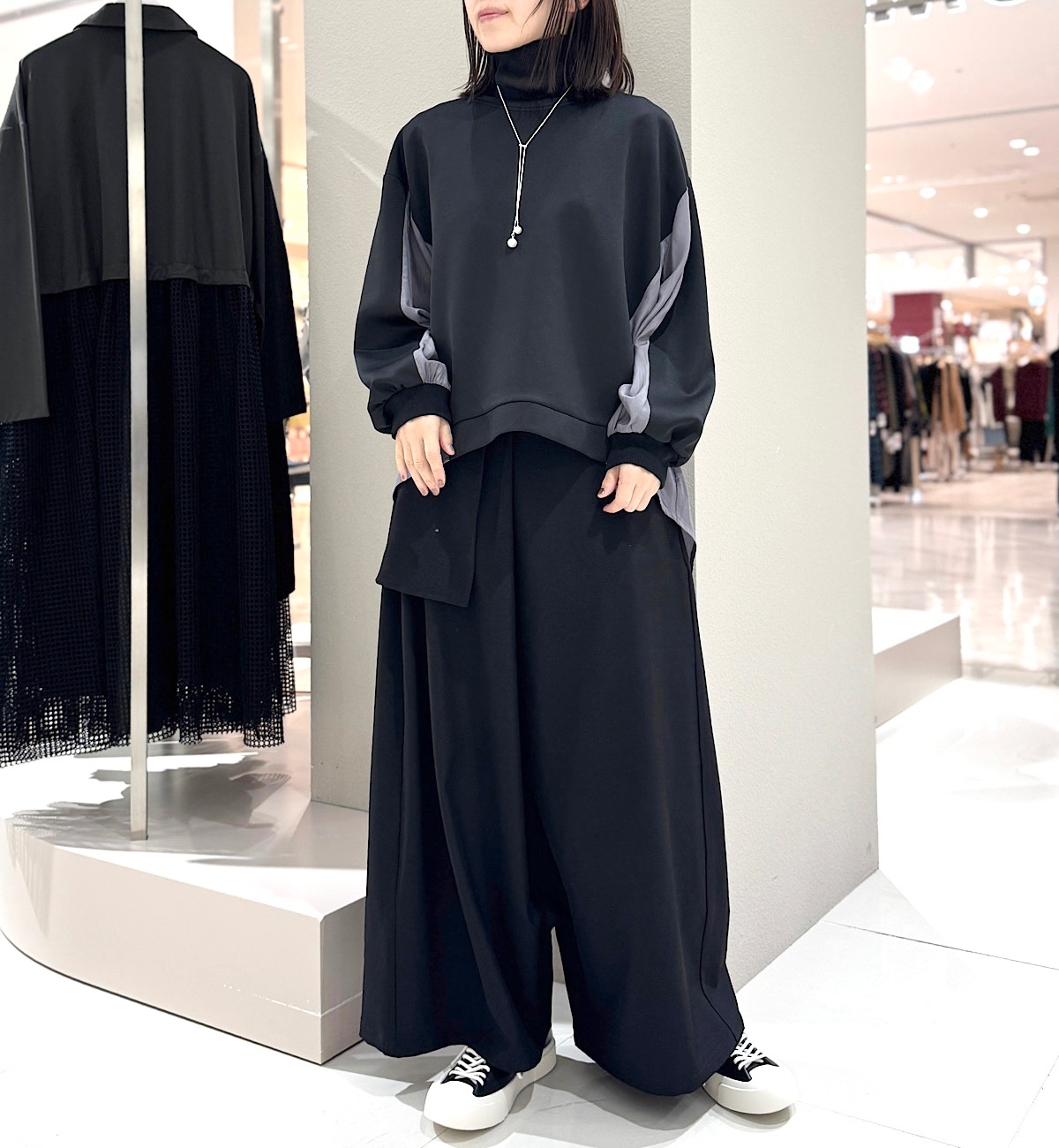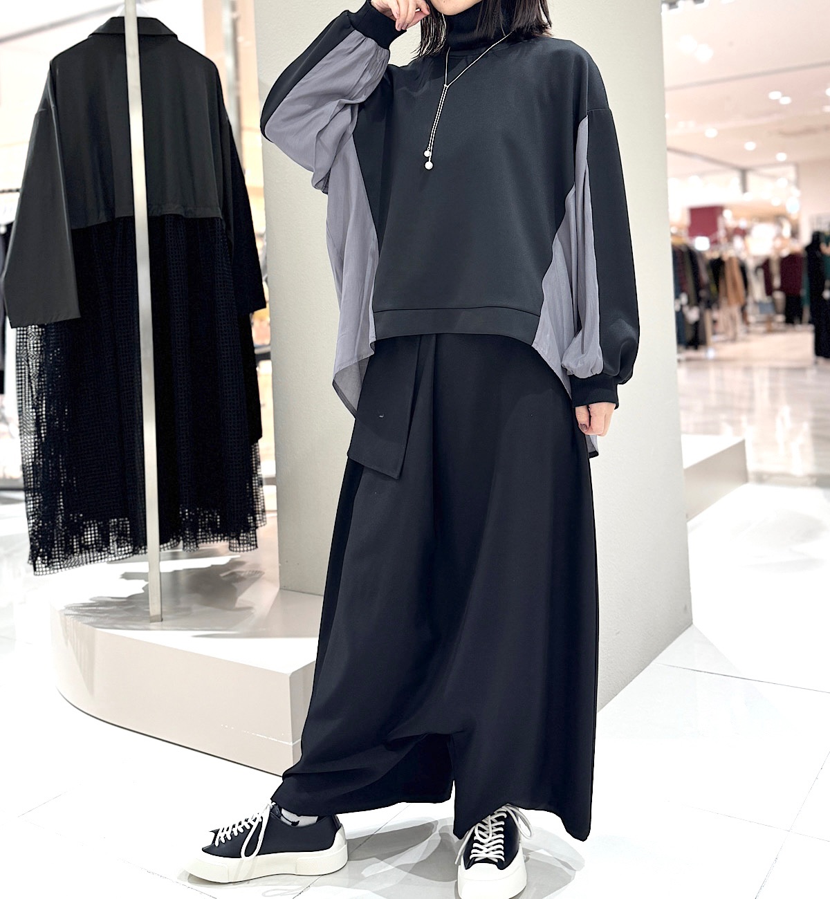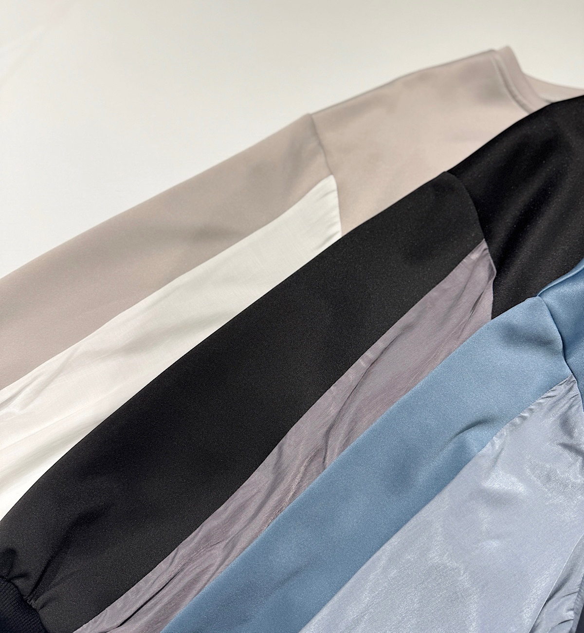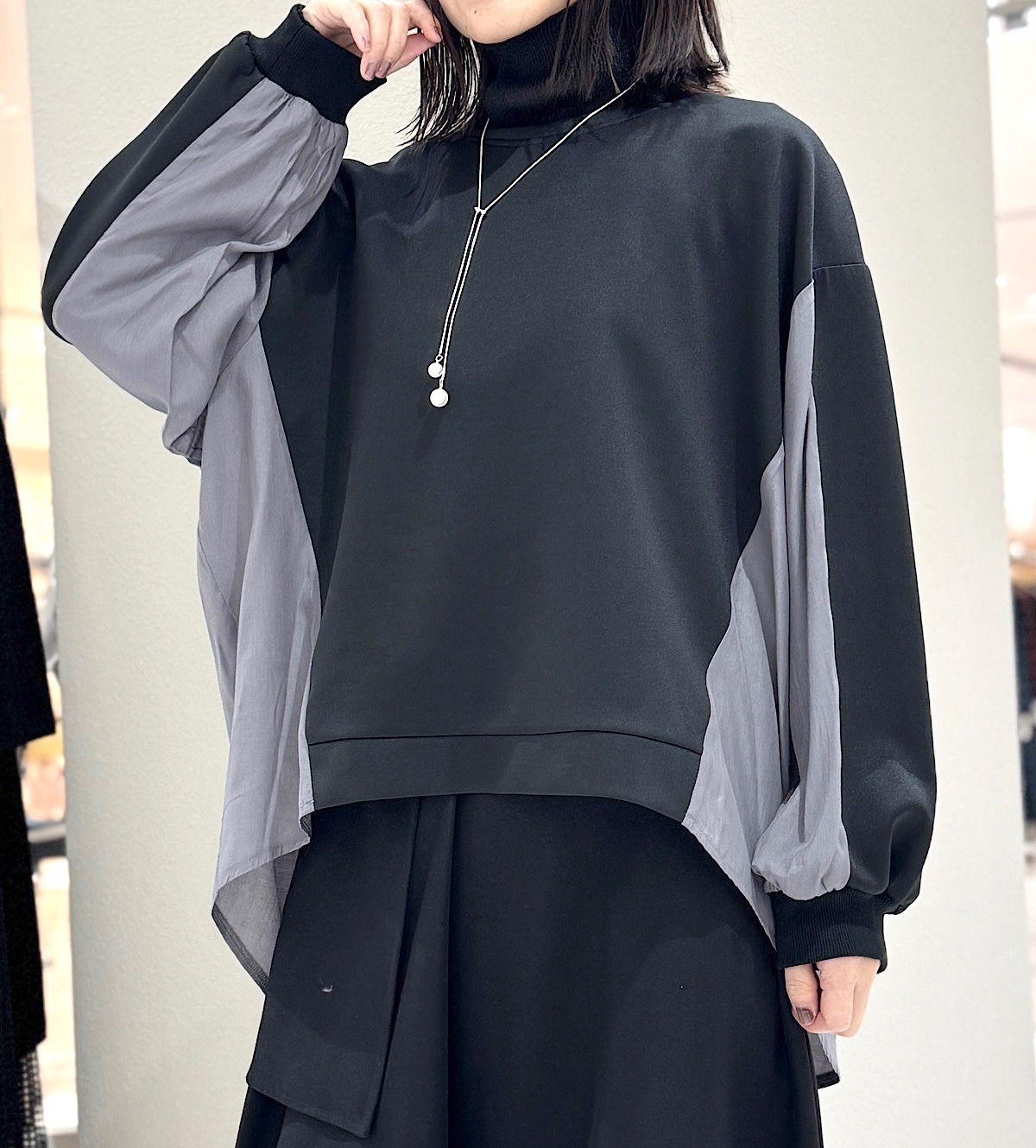 今回はやや光沢のあるカットソーに、ツヤ感のあるブラウス素材をドッキング。
