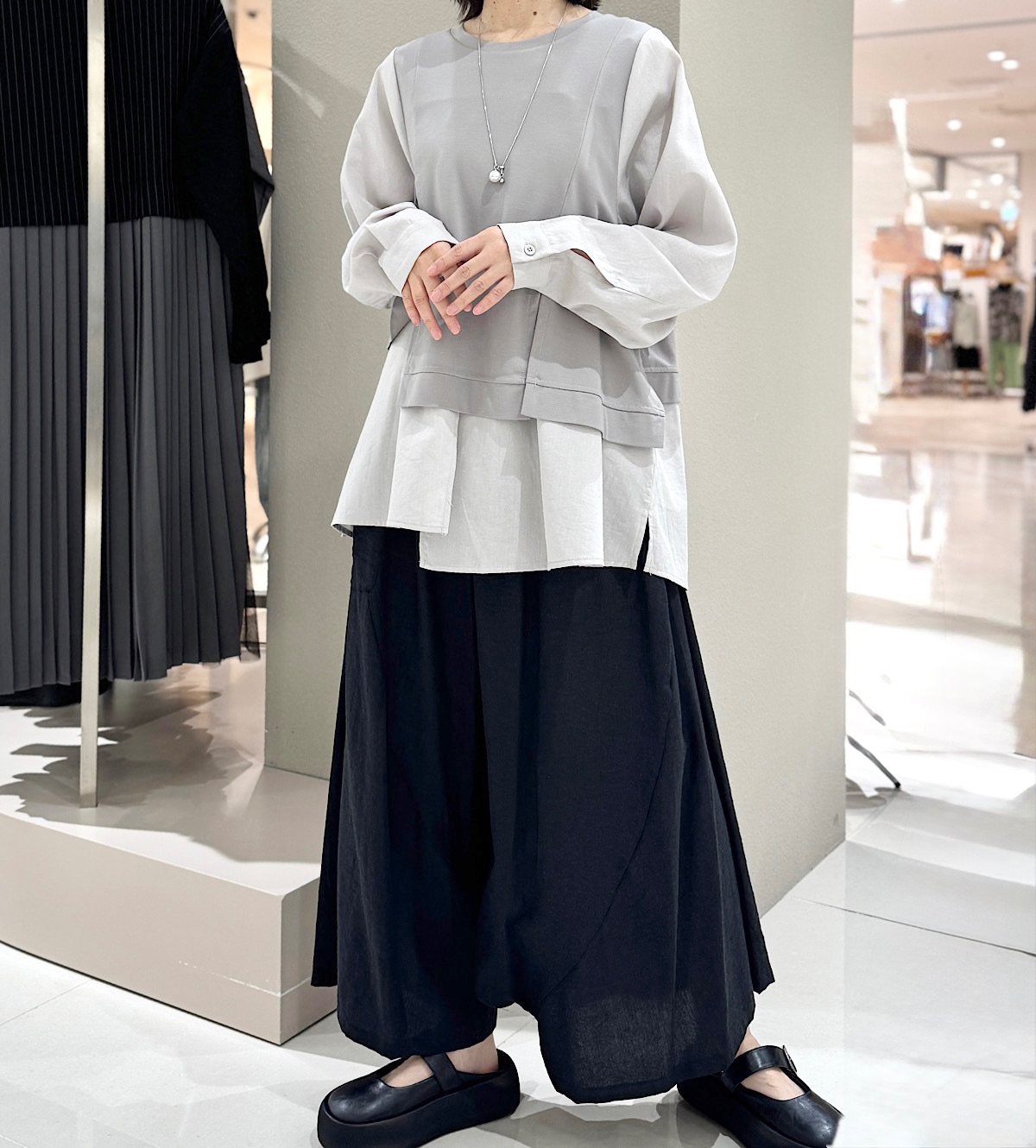 まるでスカートみたいなシルエットになるワイドなサルエルパンツ。