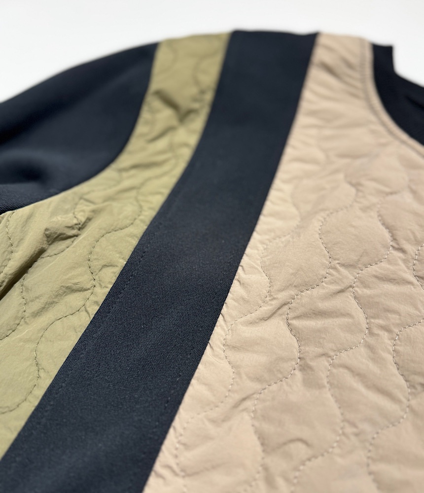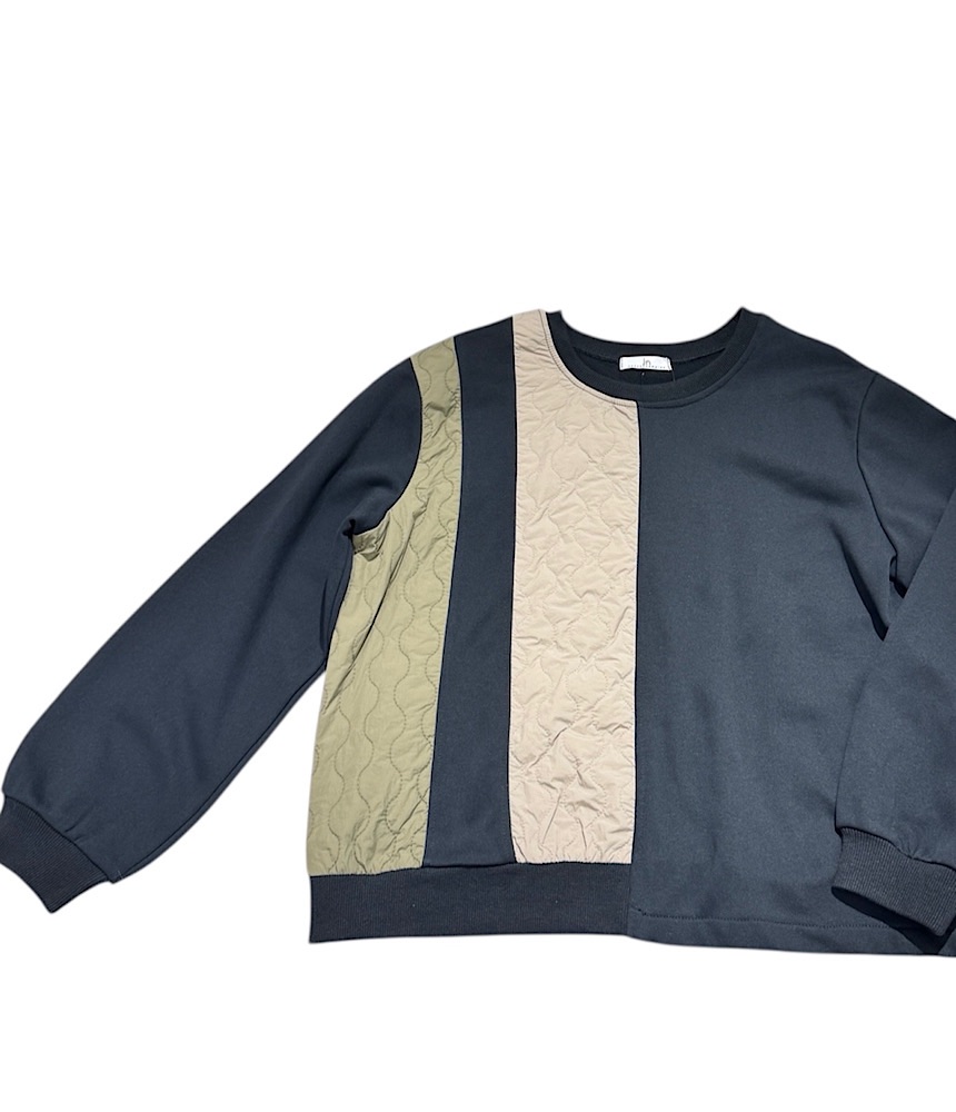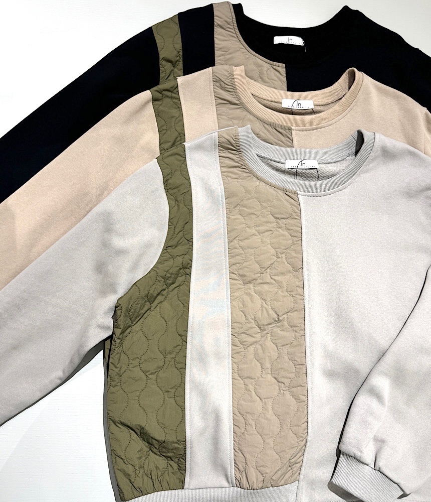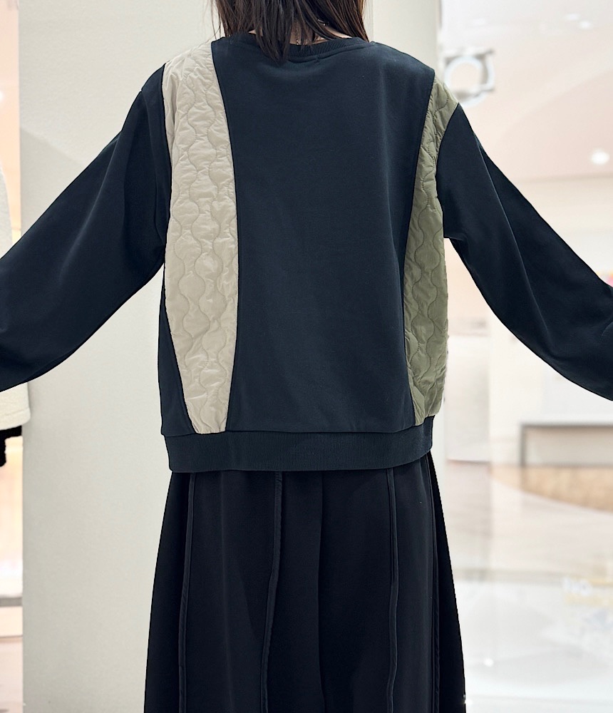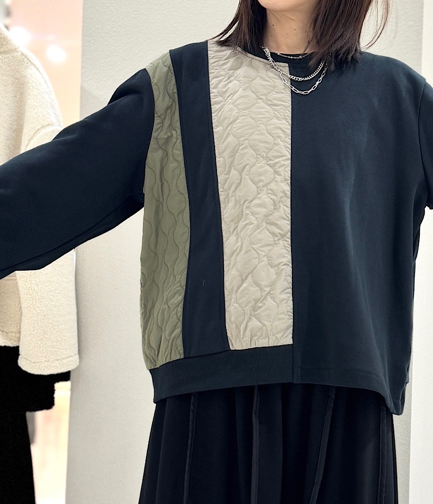 異素材がドッキングしたデザイントップス。身頃は裏毛でラフに着られて、普段使いにおすすめです。