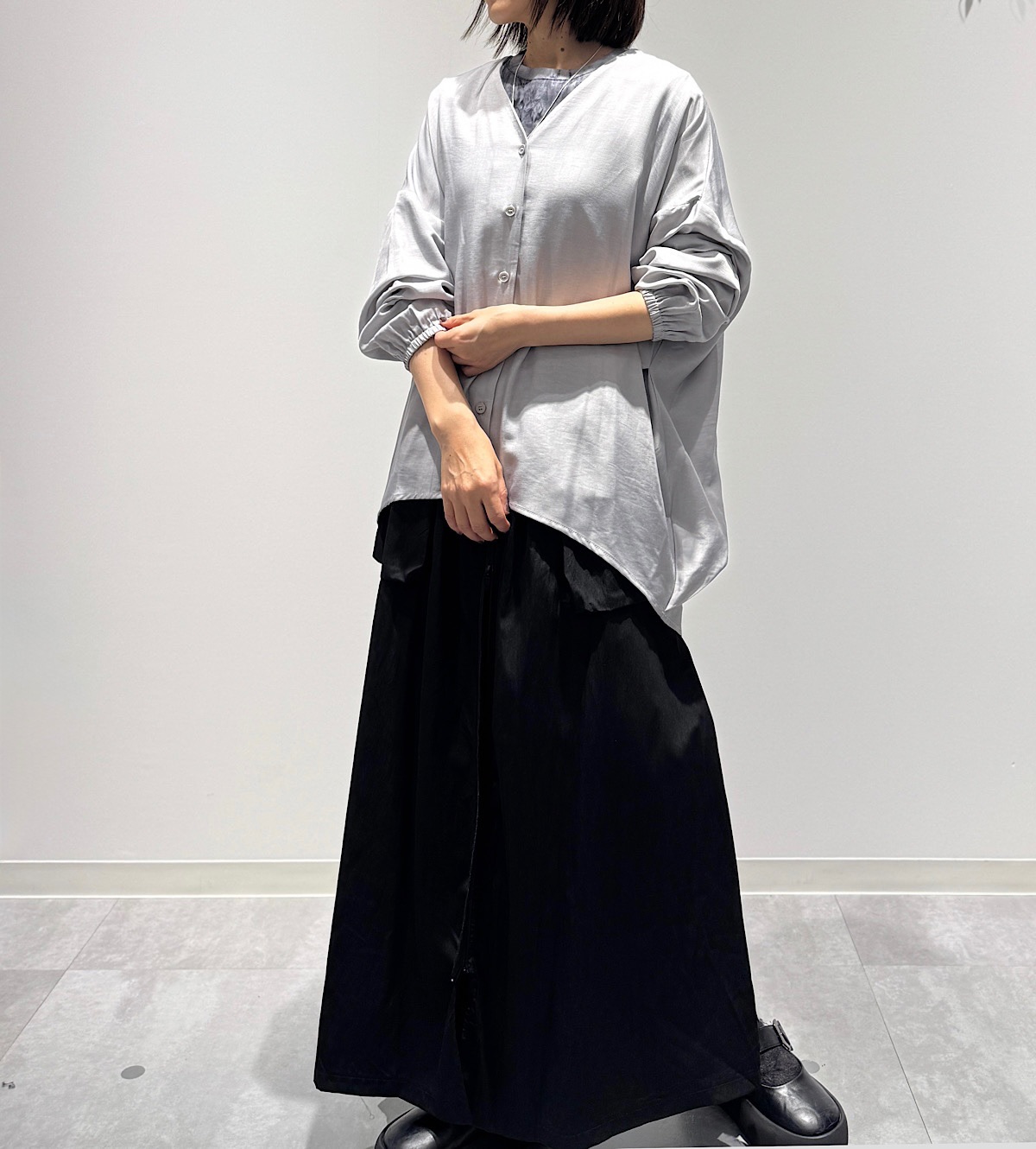 春はカーディガン代わりの羽織ものとして、初夏に向けてはそのままブラウスとして着られるVネックの前開きブラウス。