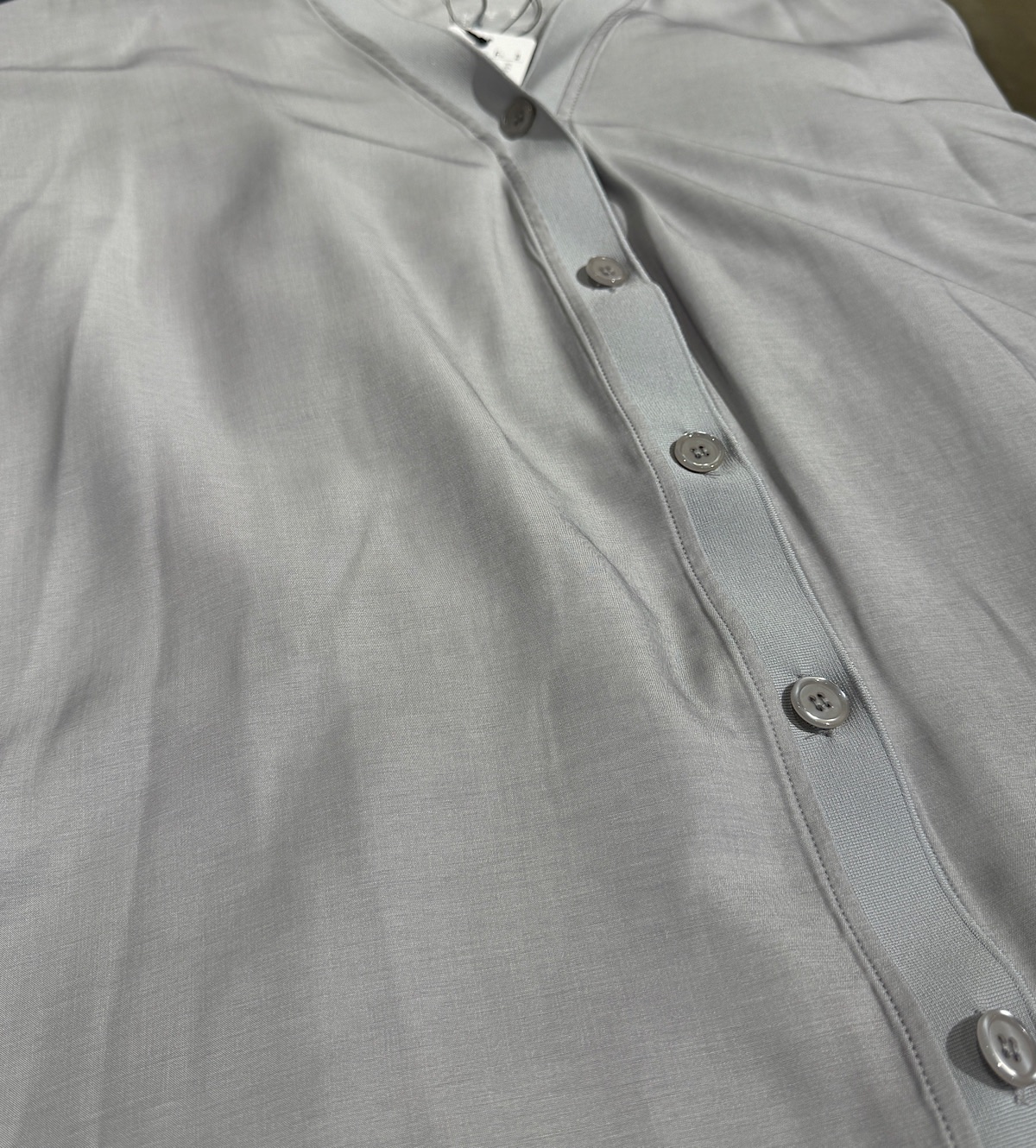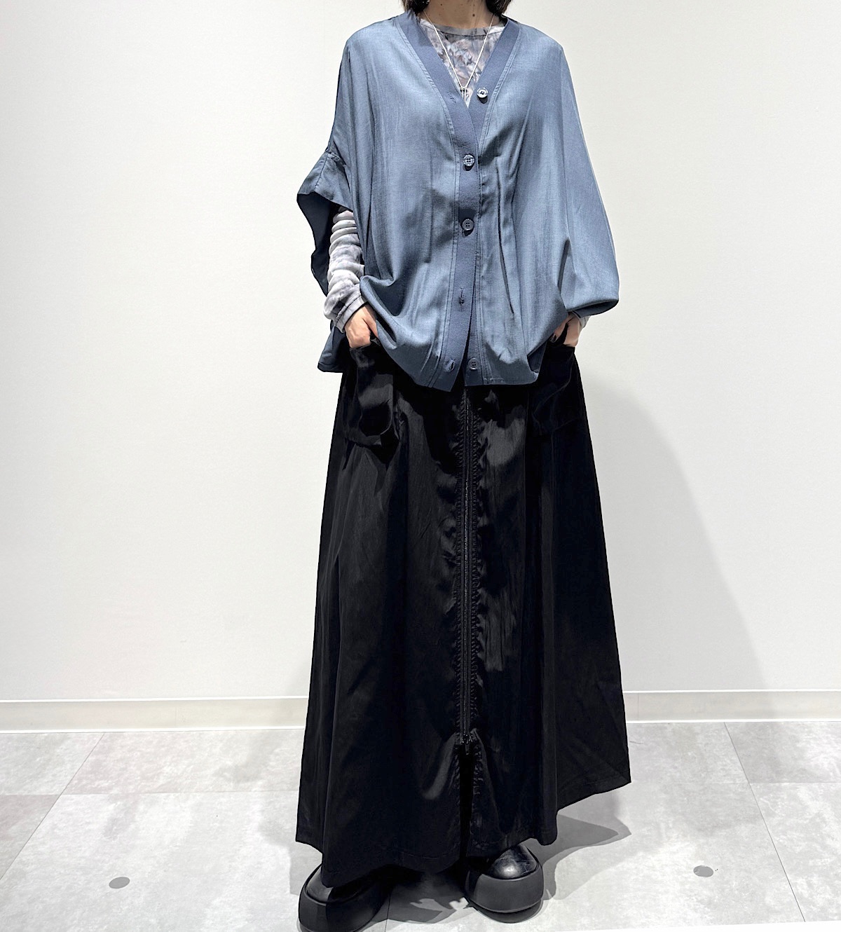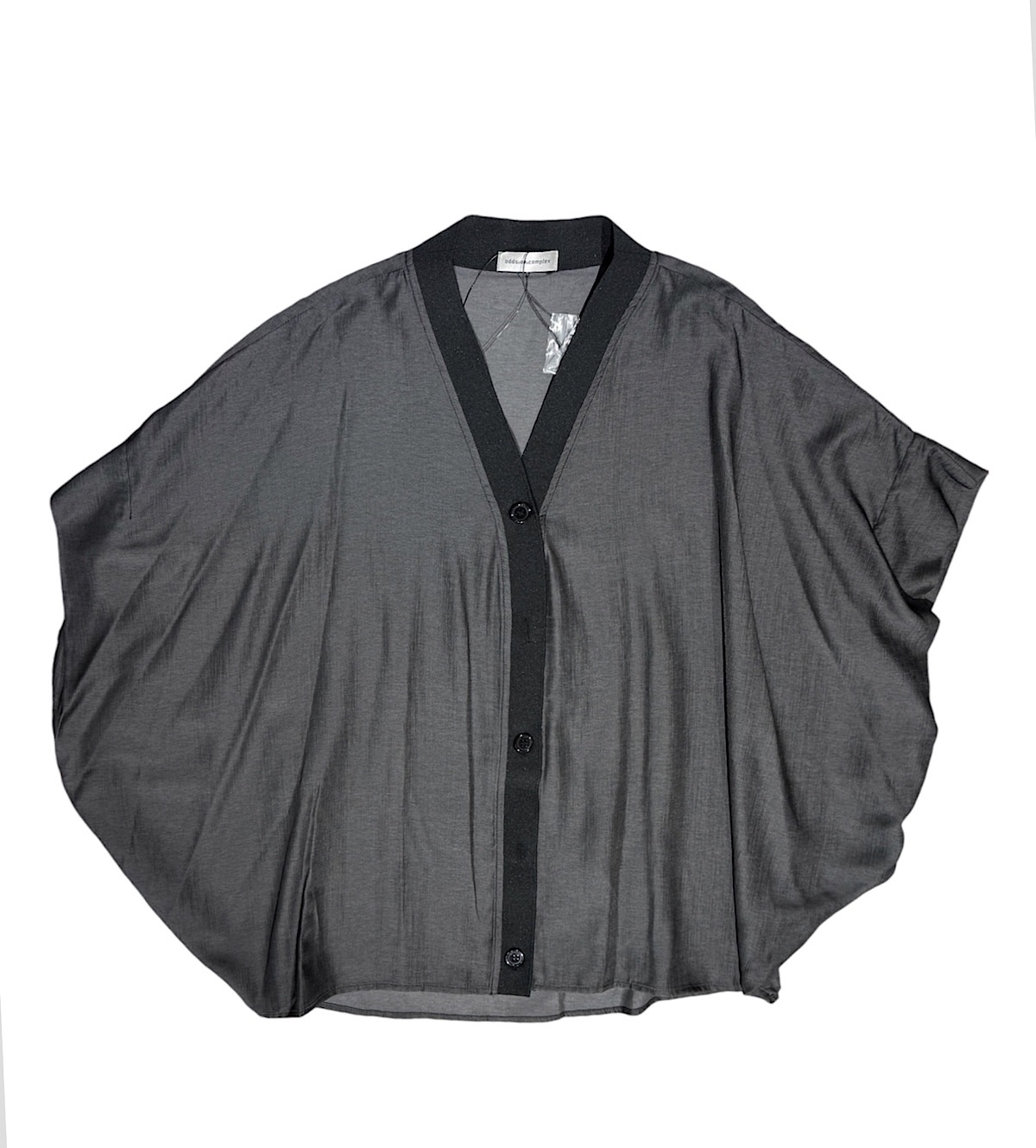 光沢のある素材のドルマンスリーブのカーディガン。