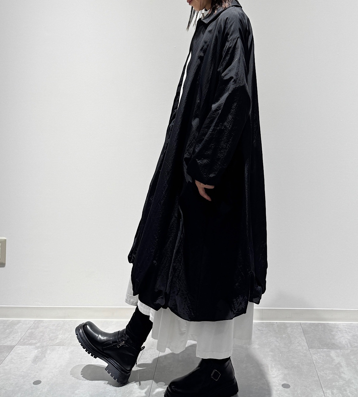 ロングで裏地付きだと重たいコートも多いですが、素材がとことん軽いため、さらっと楽に着ていただけます。