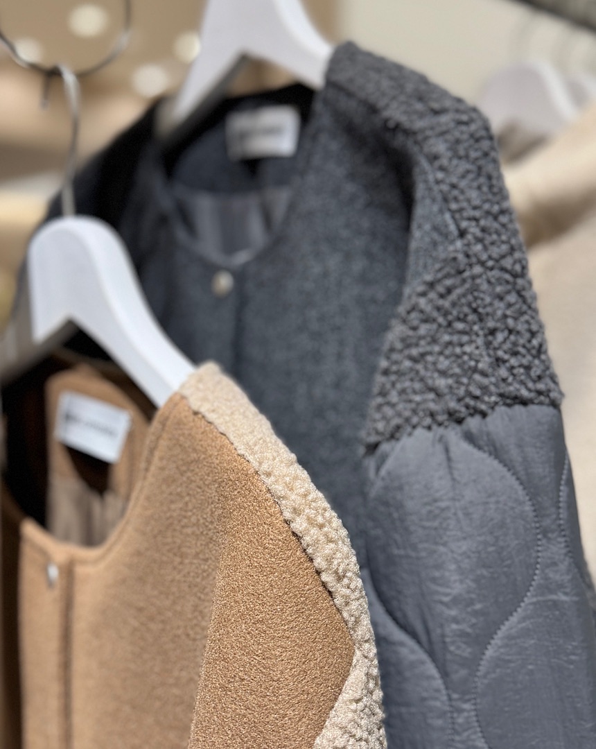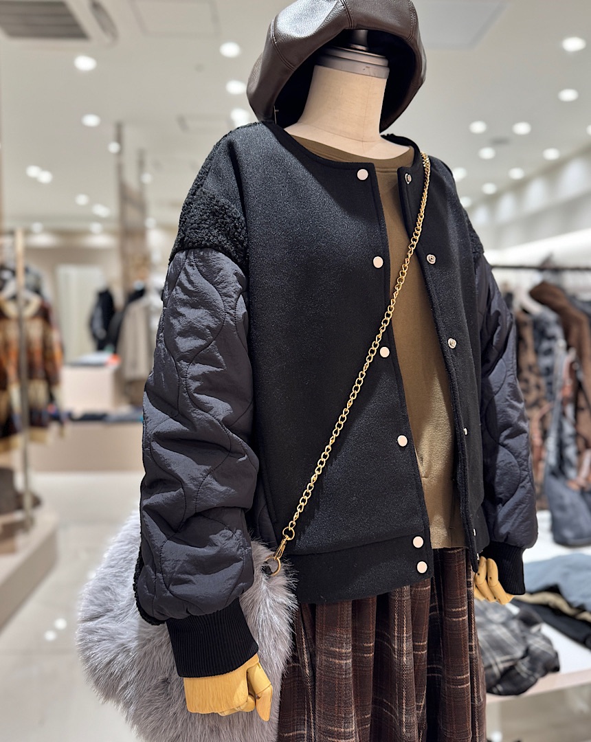 保温性が高くあたたかいボアとキルティングをWで使ったブルゾン。コートより軽く、見た目にもおしゃれな切り替えデザインなので、秋から冬にかけて活躍しそう。ノーカラーなので、冬はタートルやマフラーを合わせてもOK。