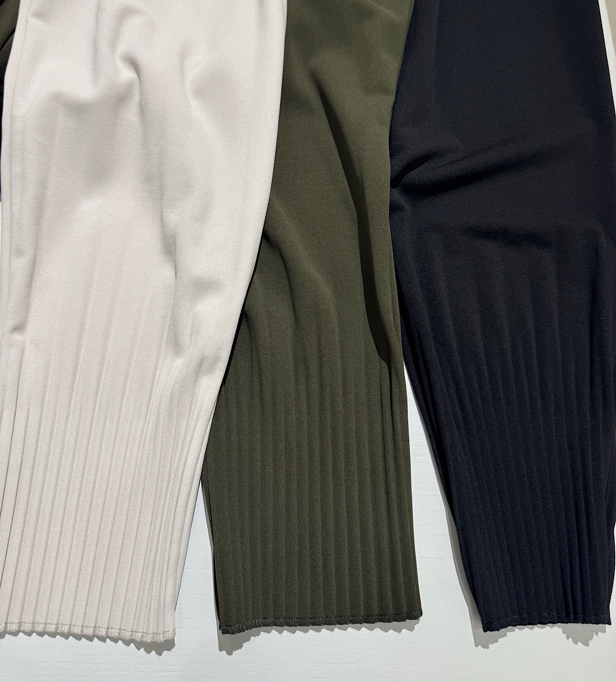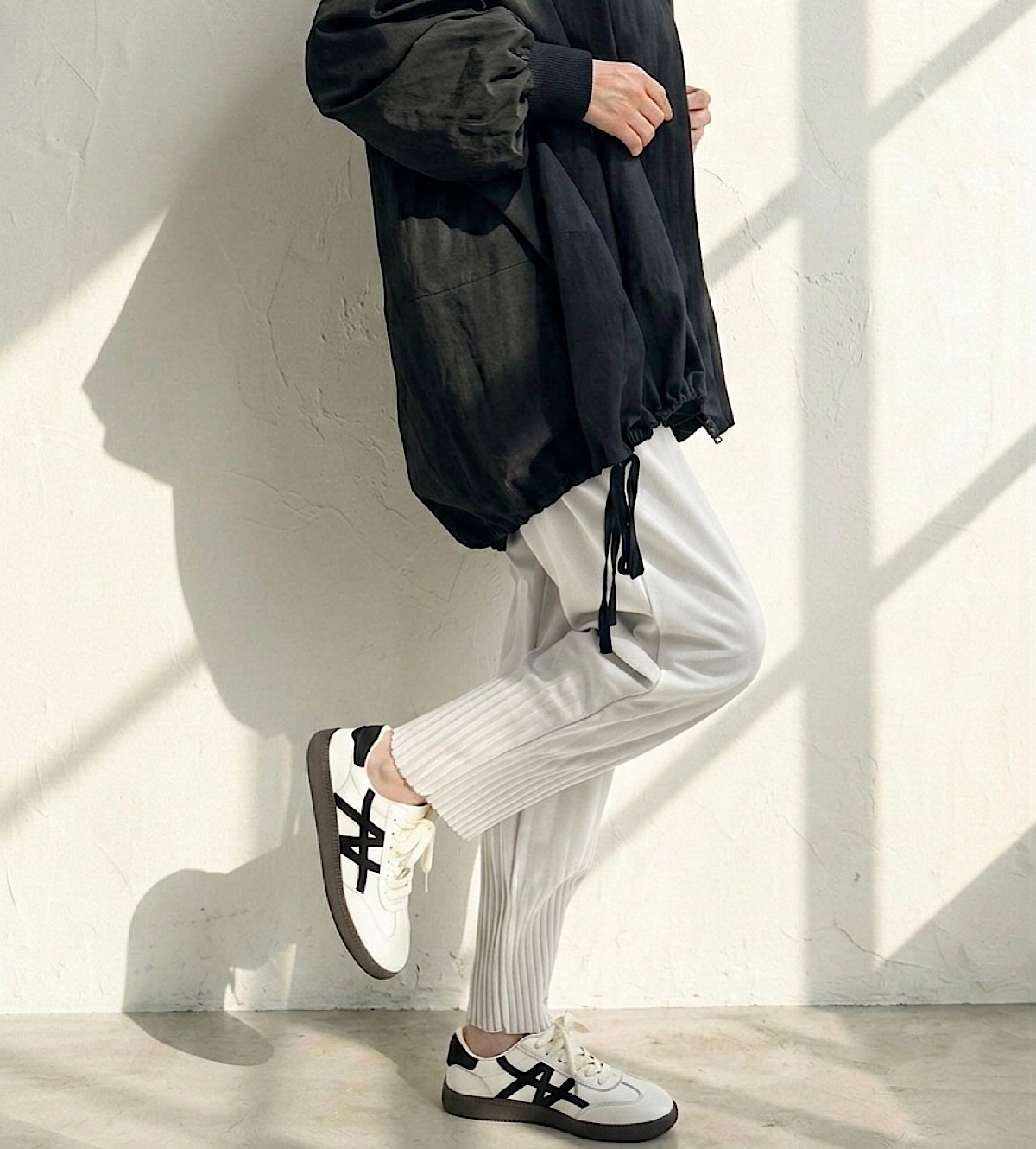 裾にかけて細くなるテーパードシルエットは、ヒップ周りがゆったりしていて足のラインを自然にカバーしてくれます。